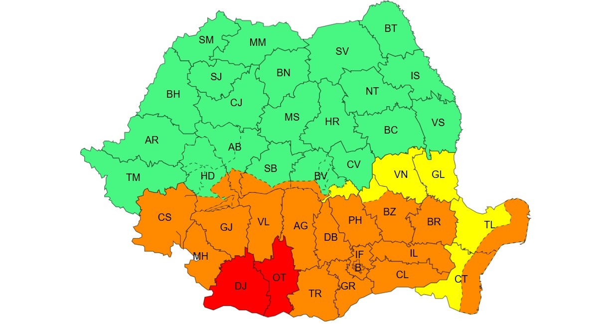 Administrația Națională de Meteorologie (ANM) a emis, joi, o avertizare Cod roșu de ploi abundente, valabilă din această seară până vineri seara în județele Dolj și Olt. Potrivit ANM, în intervalul 2 octombrie, ora 18:00 - 3 octombrie, ora 21:00, în județele avertizate (harta), va ploua abundent și se vor acumula cantități de apă de 100 - 110 l/mp.