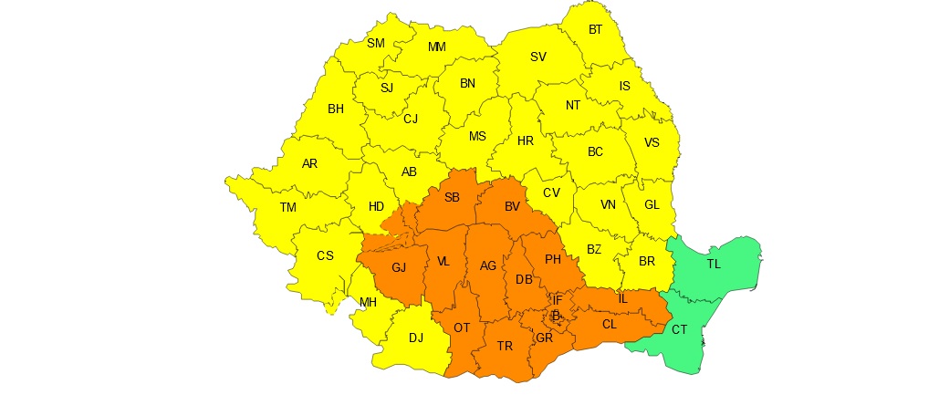 Aceste două atenţionări Cod galben vizează judeţele Maramureş, Suceava, Botoşani, Iaşi, Neamţ, Bacău, Vaslui, Galaţi, Vrancea, Buzău, Brăila, Tulcea, Constanţa, Ialomiţa, Călăraşi, Giurgiu, Ilfov, în municipiul Bucureşti şi în unele zone ale judeţelor Bistriţa-Năsăud, Harghita, Covasna, Braşov, Sibiu, Vâlcea, Argeş, Dâmboviţa, Prahova.