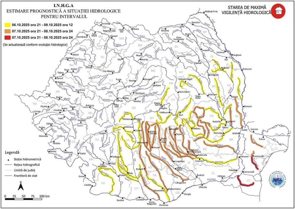 „INHGA a emis Codul Roșu valabil în intervalul 7 octombrie, ora 21:00 – 8 octombrie, ora 24:00. Acesta va viza râurile din județul Constanța.