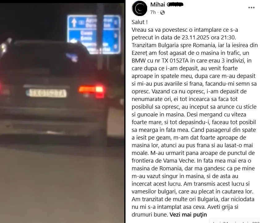 Pasagerii din BMW ar fi încercat chiar să iasă pe geam în mers, pentru a intimida șoferul. Românul a accelerat și a reușit să scape abia aproape de Punctul de Frontieră Vama Veche, unde a alertat vameșii bulgari. Aceștia ar fi pornit în căutarea agresorilor. „Sunt convins că m-au ales pentru că eram singur în mașină. Nu am mai pățit așa ceva în Bulgaria. Aveți grijă!”, avertizează el.