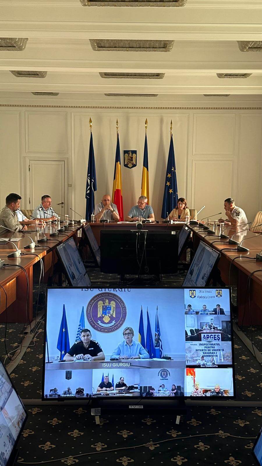 Astăzi, la sediul Ministerului Afacerilor Interne, a avut loc cea de-a doua videoconferință din cadrul seriei de întâlniri organizate pentru gestionarea situațiilor de urgență, în contextul avertizărilor meteorologice și hidrologice emise pentru perioada următoare. Această videoconferință a urmat celei desfășurate în cursul dimineții și a fost convocată de viceprim-ministrul, ministrul afacerilor interne, domnul Cătălin Predoiu, în prezența șefului DSU, domnul dr. Raed Arafat, a secretarului de stat, doamna Aneta Matei și a prim-adjunctului inspectorului general al IGSU, domnul colonel Florea Constantin, cu prefecții și inspectorii șefi ai Inspectoratelor pentru Situații de Urgență județene.