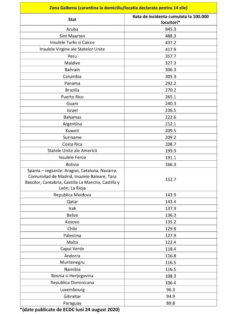 Comitetul Național pentru Situații de Urgență a aprobat noua listă propusă de Institutul Național de Sănătate Publică, a ţărilor pentru care se instituie măsura carantinei pentru persoanele care sosesc în România din zonele respective, considerate cu risc epidemiologic ridicat.