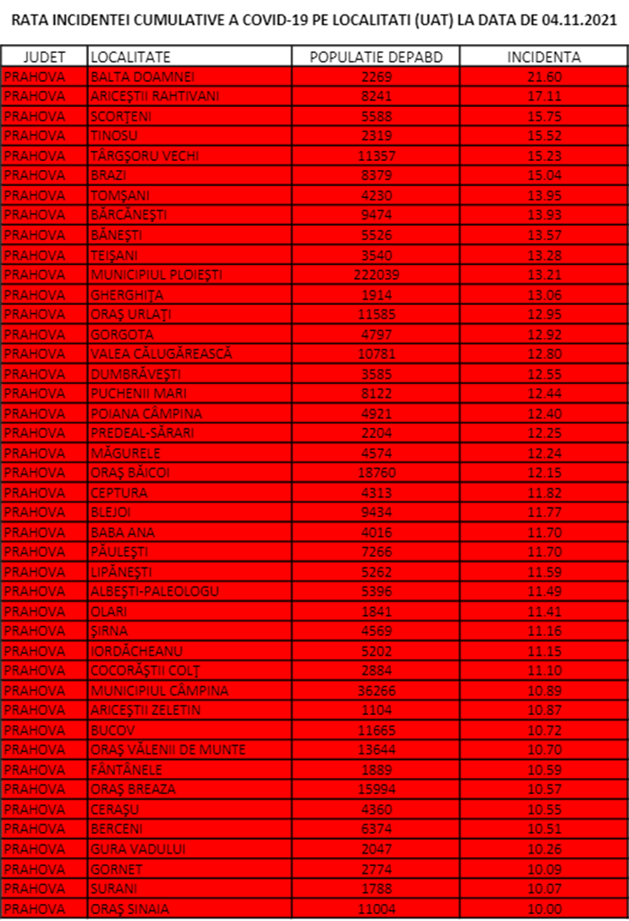 Rata de infectare, pe localități, la 4 noiembrie