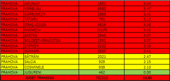 Județul Prahova a ajuns, joi, la 10,9 cazuri active la 1.000 de locuitori. Rata de infectare este în scădere de la finalul săptămânii trecute.