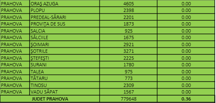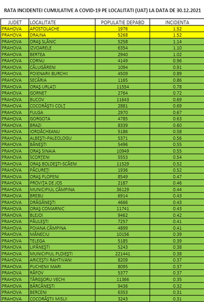 Aproape toate localitățile din Prahova sunt, în prezent, în scenariul verde, iar 39 dintre acestea au rata infectărilor 0, conform cifrelor oficiale publicate, joi, 30 decembrie, de Direcția de Sănătate Publică Prahova.