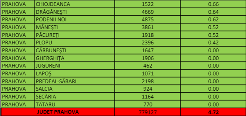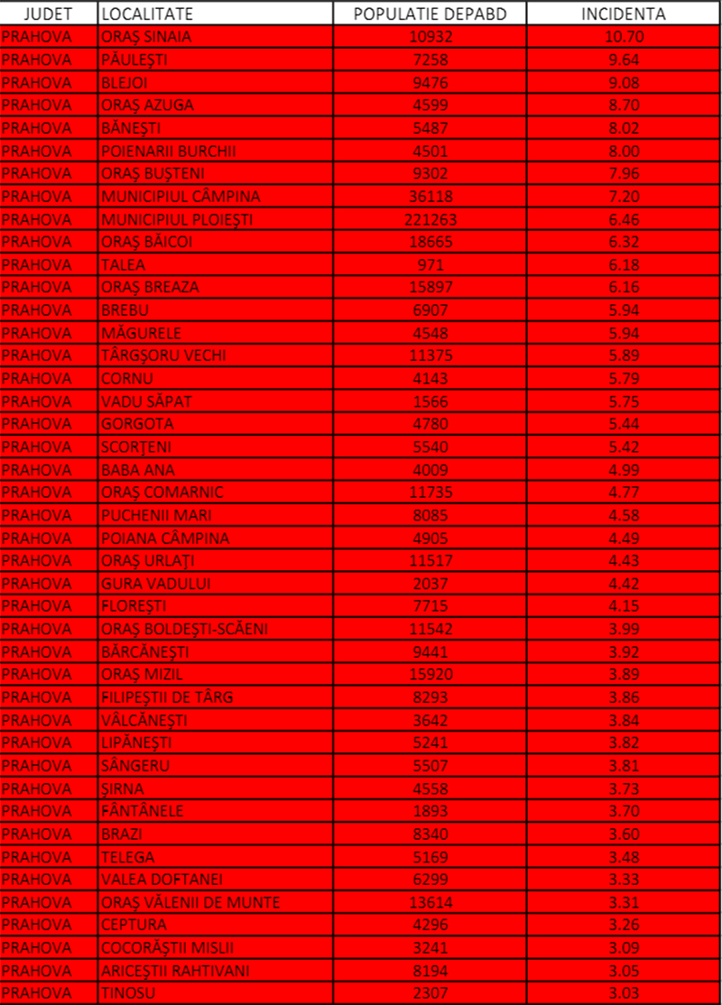 DSP Prahova a publicat situația actualizată cu rata infectărilor cu Covid  în fiecare localitate din județ. Pe 26 ianuarie, incidența în Prahova este de 4,72 la mie.