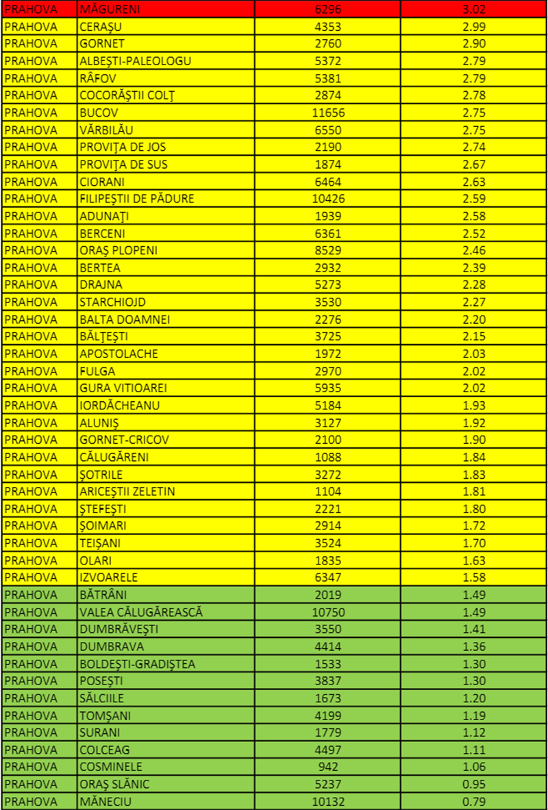 Rata infectărilor în fiecare localitate din Prahova, la data de 26 ianuarie: