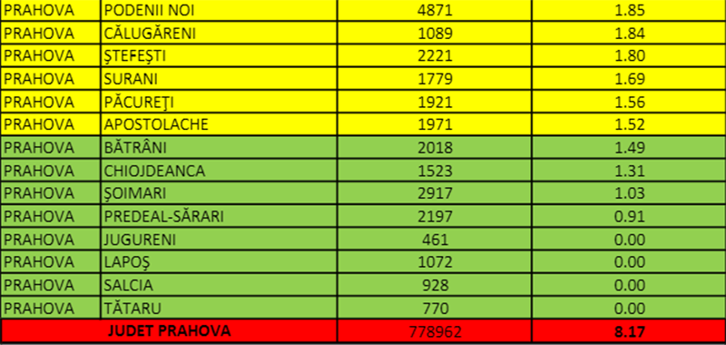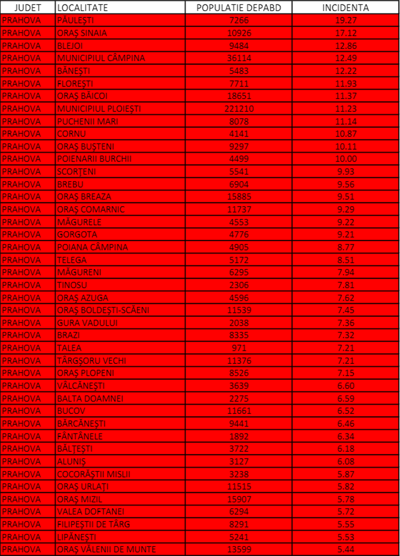 În prima zi a lunii ianuarie incidența pe județ era calculată la 0,37 la mie și doar două localități erau în scenariul galben, iar restul în verde. Astăzi, la exact o lună distanță, Slănic este singurul oraș cu incidența sub 3 la mie, în timp ce 75% dintre localitățile județului sunt în scenariul roșu, iar rata de infectare a ajuns la 8,17 la mie.