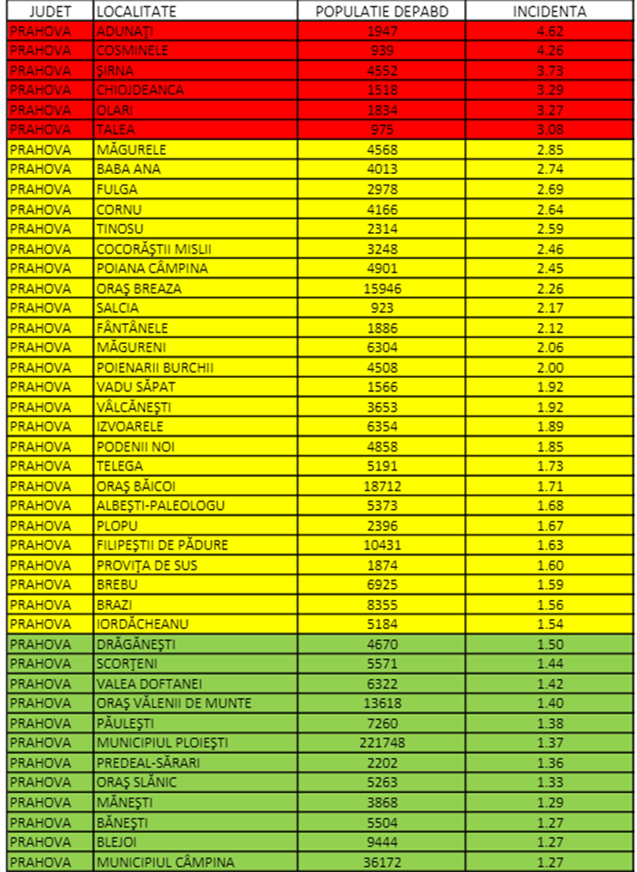 În schimb, în scenariul roșu (incidența peste 3 la mie) mai sunt doar Adunați, Cosminele, Șirna, Chiojdeanca, Olari, Talea.