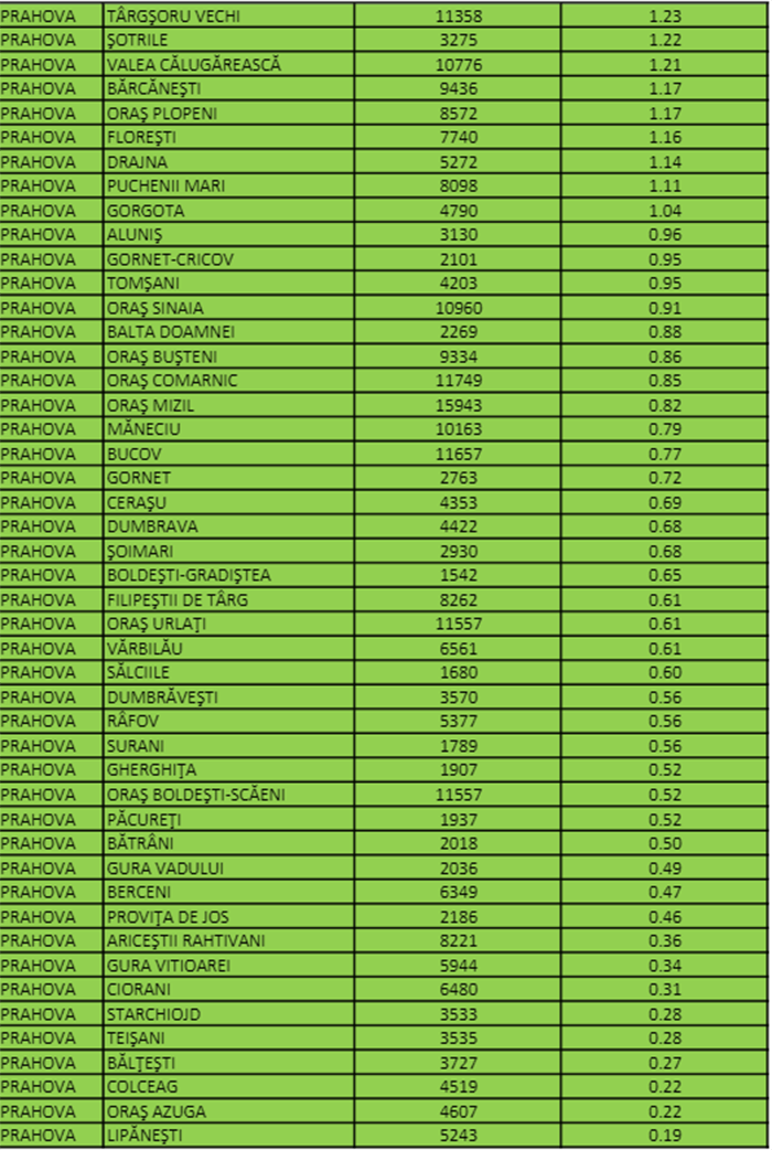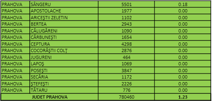Din 104 localități, 73 de comune și orașe prahovene sunt, în prezent, în scenariul verde, iar 13 dintre ele nu au niciun caz Covid. Este vorba despre Apostolache, Ariceștii Zeletin, Bertea, Călugăreni, Cărbunești, Ceptura, Cocorăștii Colț, Jugureni, Lapoș, Posești, Secăria, Ștefești, Tătaru, potrivit situației publicate de Direcția de Sănătate Publică.