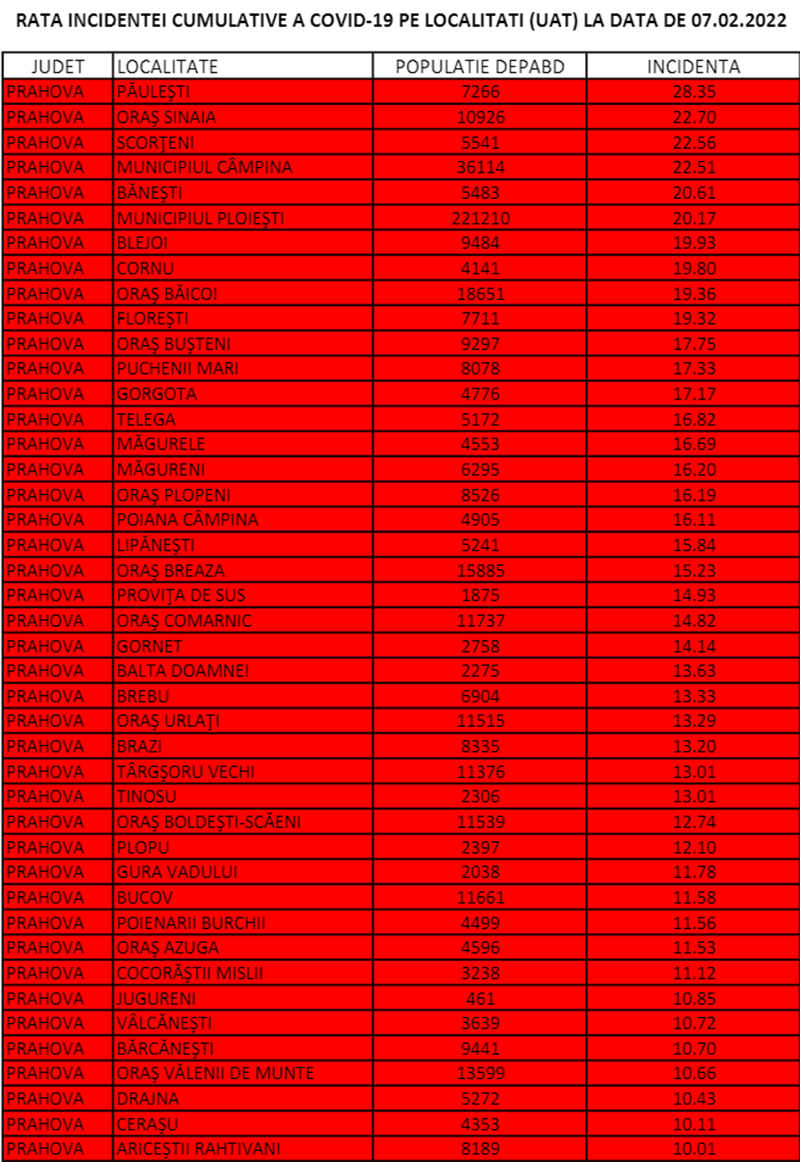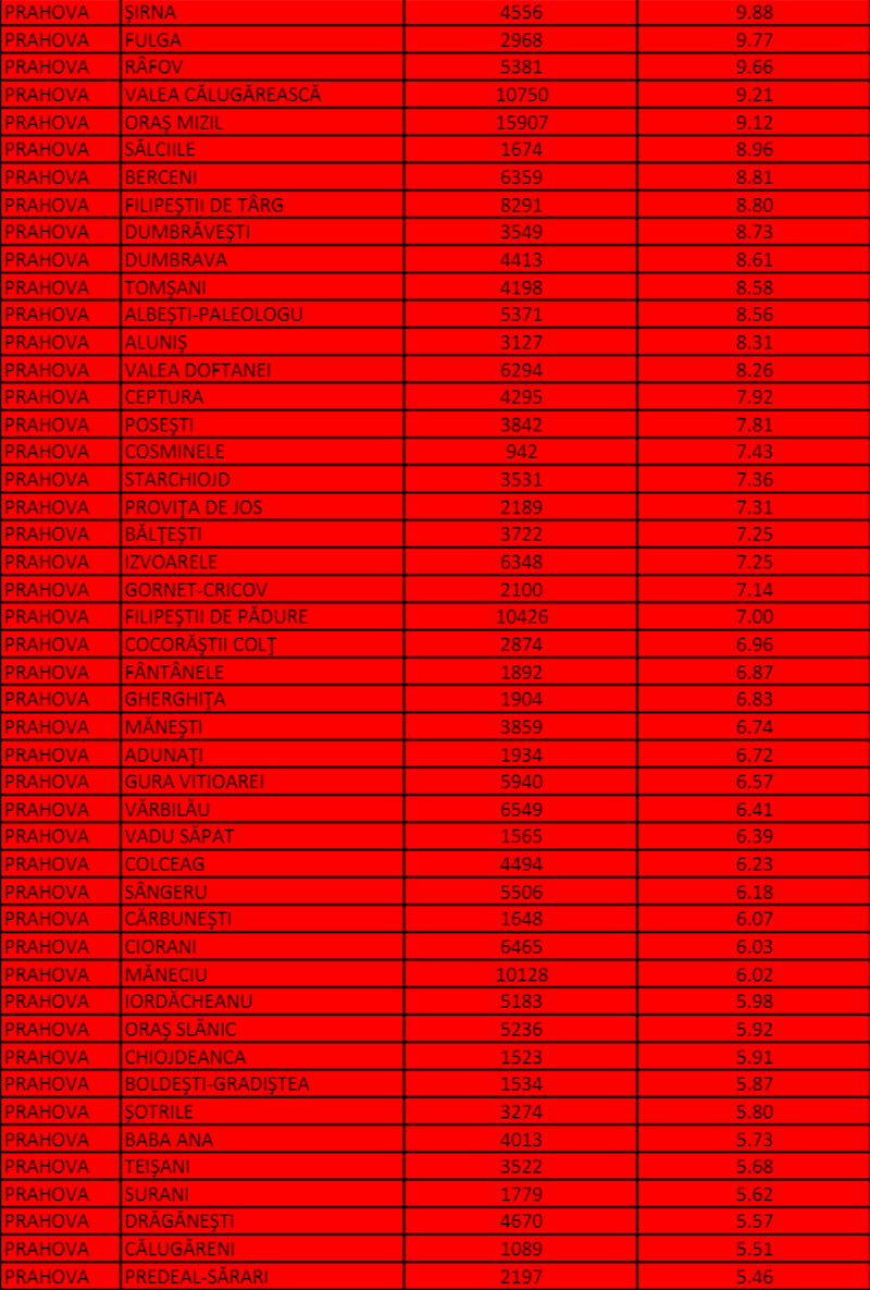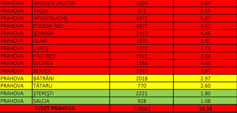 Incidență peste 20 la mie se înregistrează la Ploiești și Câmpina, dar și la Sinaia, Scorțeni și Bănești. La Păulești, rata de infectare se apropie chiar de 30 la mie.