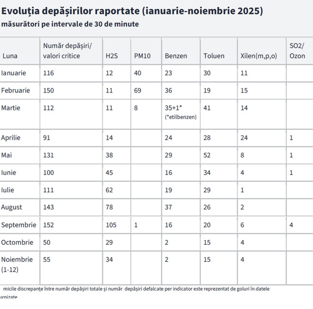 ● Până la 12 noiembrie, deci pe parcursul a 322 de zile, au fost raportate 1.211 episoade de depășiri (pentru H2S și PM10) sau valori critice (pentru benzen, toluen și xileni) pe intervale de 30 de minute, cu vârfuri în lunile februarie și august;