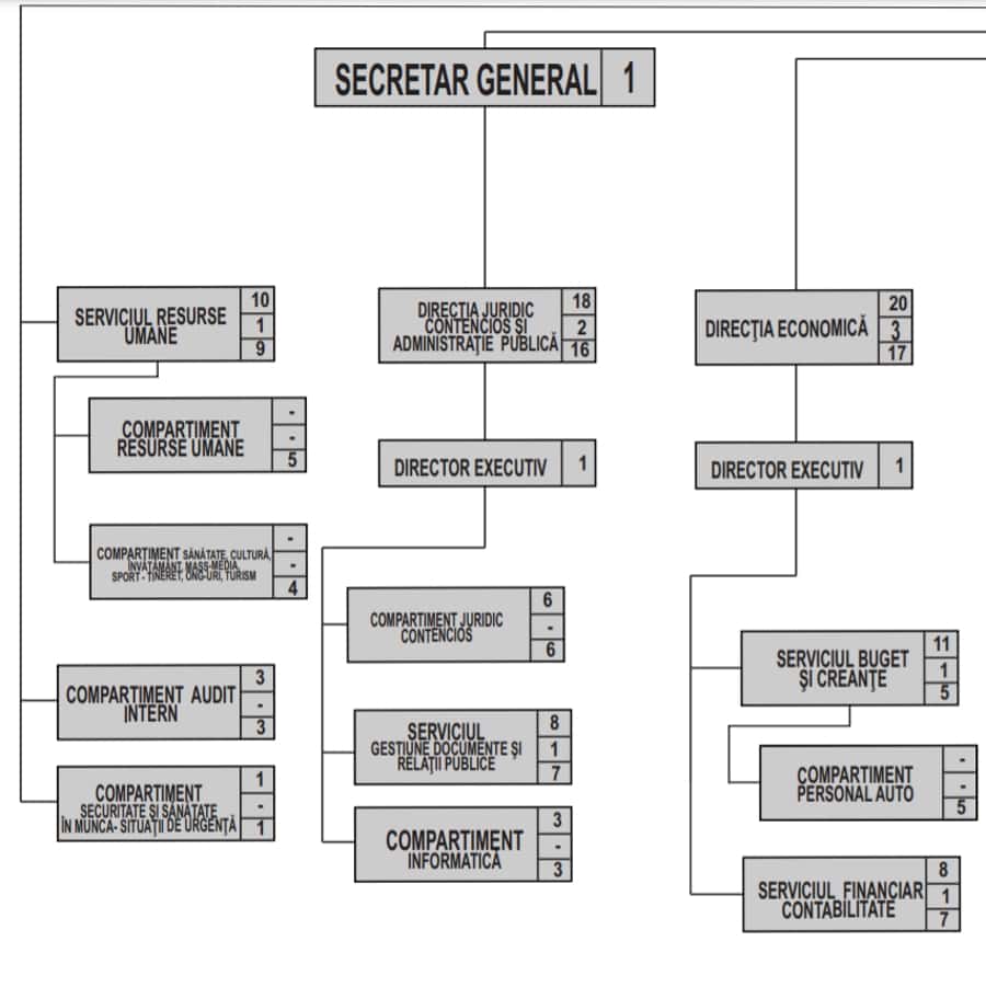 În momentul de faţă, organigrama instituţiei cuprinde 247 de posturi, dintre care 196 de funcţionari publici şi 51 pentru personal contractual, aici fiind incluşi şi preşedintele şi cei doi vicepreşedinţi, cu statut de demnitari, administratorul public şi 6 consilieri personali. În total sunt 28 de funcţii de conducere. În noua formulă, aparatul de specialitate ar urma să ajungă la 146 de posturi, dintre care 117 funcţii publice şi 29 funcţii contractuale sau alte categorii de personal, cuprinzându-le, din nou, pe cele de demnitari şi angajaţi la cabinetele preşedintelui şi vicepreşedinţilor.