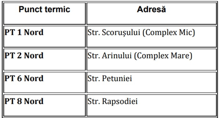 Potrivit comunicatului transmis de reprezentanții operatorului, măsura este valabilă până miercuri, la ora 22.00, și vizează următoarele puncte termice:
