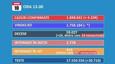 În ultimele 24 de ore au fost înregistrate 4.104 cazuri COVID noi, cu 608 mai puțin decât în ziua anterioară. 239 dintre cazurile noi din 24 de ore sunt ale unor pacienți reinfectați, testați pozitiv la o perioadă mai mare de 180 de zile după prima infectare: