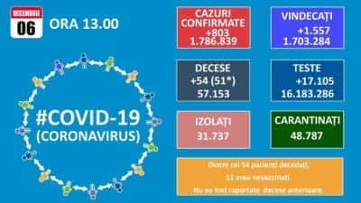 Până astăzi, 57.153 de persoane diagnosticate cu infecție cu SARS – CoV – 2 au decedat. În intervalul 05.12.2021 (10:00) – 06.12.2021 (10:00) au fost raportate de către INSP 54 de decese (28 bărbați și 26 femei), ale unor pacienți infectați cu noul coronavirus, internați în spitalele din Alba, Arad, Argeș, Bacău, Botoșani, Brăila, Brașov, Caraș-Severin, Cluj, Dolj, Gorj, Harghita, Sălaj, Satu Mare, Sibiu, Suceava, Timiș, Vaslui și municipiul București.