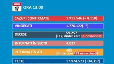 Până astăzi, 59.257 de persoane diagnosticate cu infecție cu SARS – CoV – 2 au decedat. În intervalul 16.01.2022 (10:00) – 17.01.2022 (10:00) au fost raportate de către INSP 17 decese (9 bărbați și 8 femei), ale unor pacienți infectați cu noul coronavirus, internați în spitalele din Alba, Bihor, Brăila, Brașov, Caraș-Severin, Maramureș, Mehedinți, Prahova, Satu Mare, Timiș şi Vaslui. Nu au fost raportate decese anterioare intervalului de referință.