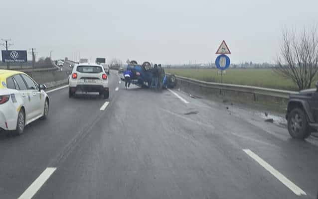 O mașină este răsturnată pe șosea, iar circulația este îngreunată.