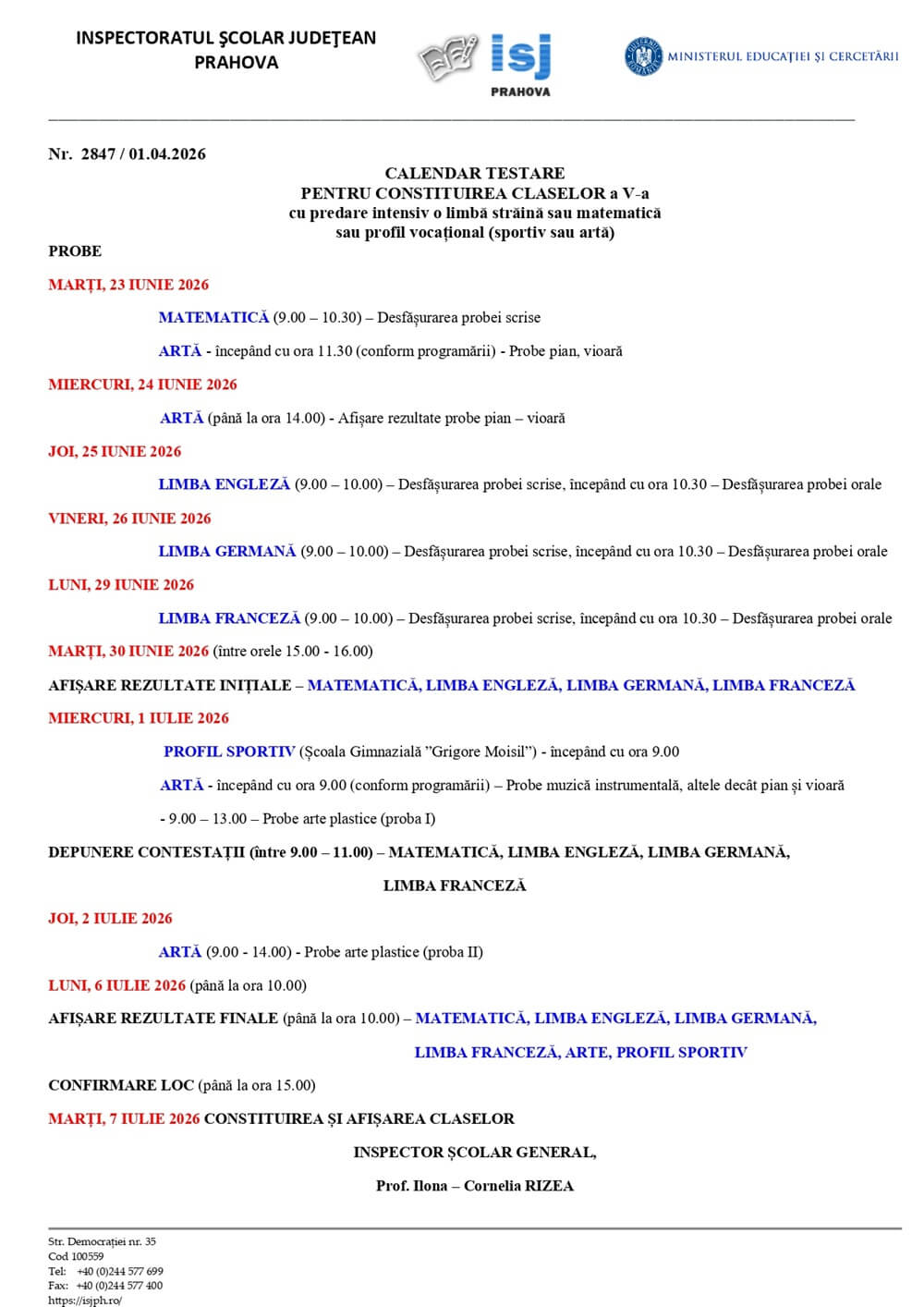 Calendarul elaborat de ISJ Prahova, publicat pe site-ul CNMV Ploiești, include probe la matematică, limbi străine (engleză, germană și franceză, precum și probe de aptitudini, pentru admiterea, în clasa a V-a, la Colegiul de Artă „Carmen Sylva” Ploiești ori la clasa cu profil sportiv de la Școala „Grigore Moisil” Ploiești.