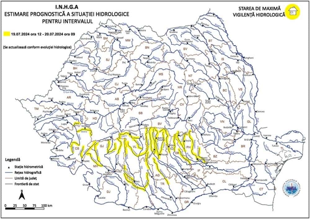 Potivit INHGA, se pot produce scurgeri importante pe versanţi, torenţi şi pâraie, viituri rapide pe râurile mici cu posibile efecte de inundaţii locale şi creşteri de debite şi niveluri pe unele râuri din bazinele hidrografice menţionate, cu posibile depăşiri ale cotelor de atenție. Sunt vizate râurile din bazinele hidrografice Timiş – bazin amonte S.H. Teregova şi afluenţii aferenţi sectorului aval S.H. Teregova – amonte S.H. Lugoj (judeţele: Caraş-Severin şi Timiş), Nera – bazin superior şi afluenţi bazin mijlociu şi inferior (judeţul Caraş-Severin), Cerna – bazin superior şi afluenţi bazin mijlociu şi inferior (judeţele: Gorj şi Caraş-Severin), Jiu – afluenţii aferenţi sectorului aval S.H. Sadu – amonte confluenţă cu râul Gilort (judeţul Gorj), Motru – bazin superior şi afluenţi bazin mijlociu şi inferior (judeţele: Gorj şi Mehedinţi), Gilort - bazin superior şi afluenţi bazin mijlociu şi inferior (judeţul Gorj), Olt - afluenţii aferenţi sectorului aval confluenţă cu râul Cibin (judeţele: Sibiu, Vâlcea, Argeş, Gorj, Dolj şi Olt), Vedea - bazin superior şi afluenţi bazin mijlociu şi inferior (judeţele: Argeş, Olt şi Teleorman), Argeş – bazin superior, Dâmboviţa – bazin superior (judeţele: Argeş şi Dâmboviţa), Ialomiţa – bazin amonte S.H. Pucioasa şi afluenţii aferenţi sectorului aval S.H. Pucioasa - amonte S.H. Siliştea Snagovului (judeţele: Dâmboviţa şi Prahova), Prahova – bazin superior şi afluenţi bazin mijlociu şi inferior (judeţele: Prahova şi Ialomiţa).