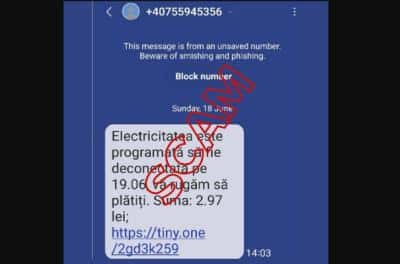 Echipa DNSC a lansat un nou avertisment privind un val de atacuri de tip phishing prin intermediul SMS-urilor. De această dată sunt vizați clienții Transelectrica. Campania folosește scenariul deconectării serviciilor pentru neplată, așa cum se poate observa din imaginile atașate.