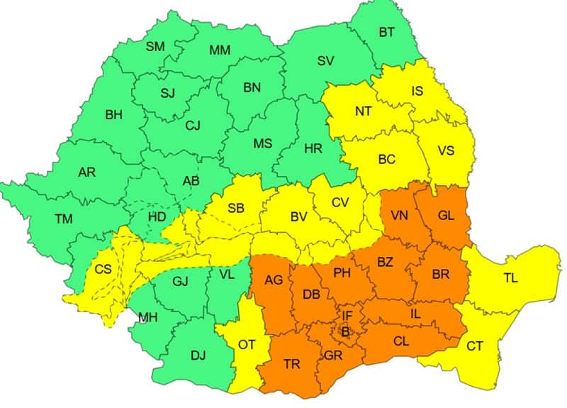 În Dobrogea, jumătatea sudică a Moldovei, estul Munteniei, sud-estul Transilvaniei și în Carpații Meridionali și de Curbură, temporar va ninge viscolit și se va depune strat de zăpadă, în medie de 10...15 cm și vizibilitatea va fi redusă sub 100 m. Vântul va avea viteze de 50...70 km, iar în zona montană înaltă rafalele vor atinge 70...90 km/h.