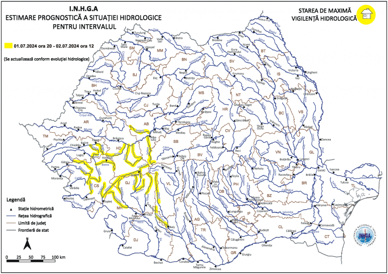 Potrivit hidrologilor, în intervalul 1 iulie, ora 20:00 - 2 iulie, ora 12:00, se pot produce scurgeri importante pe versanţi, torenţi şi pâraie, viituri rapide, creşteri de debite şi de niveluri, cu posibile depăşiri ale Cotelor de atenţie, pe râurile din bazinele hidrografice: