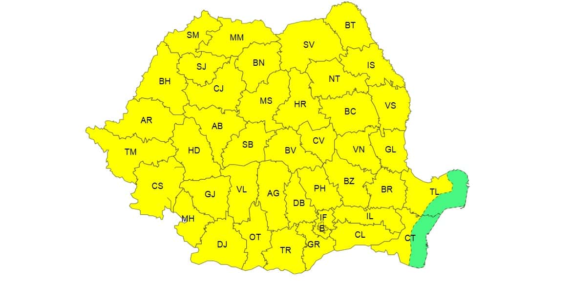 Codul galben este valabil de vineri, de la ora 10.00, până sâmbătă, la ora 06.00.