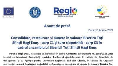 Parohia Hagi Enuși, în calitate de Beneficiar în cadrul Contractul de finanțare nr. 1902/03.05.2018 încheiat cu Ministerul Dezvoltării, Lucrărilor Publice și Administrației, în calitate de Autoritate de Management și cu Agenția pentru Dezvoltare Regională Sud-Vest Oltenia, în calitate de Organism Intermediar, anunță finalizarea proiectului <<Consolidare, restaurare și punere în valoare Biserica Toți Sfinții Hagi Enuș - corp C1 și turn clopotniță - corp C3 în cadrul ansamblului Bisericii Toți Sfinții Hagi Enuș>>, cod SMIS: 119854, finanțat prin Programul Operațional Regional 2014-2020, Axa prioritară 5 - Îmbunătățirea mediului urban și conservarea, protecția și valorificarea durabilă a patrimoniului cultural, Prioritatea de investiții 5.1 - Conservarea, protejarea, promovarea și dezvoltarea patrimoniului natural și cultural, Apelul de proiecte POR/2017/5/5.1/2.