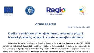 Data: 10 Februarie 2022 Mănăstirea Aninoasa, în calitate de Beneficiar în cadrul Contractul de finanțare nr. 609/ 20.10.2017 încheiat cu Ministerul Dezvoltării,