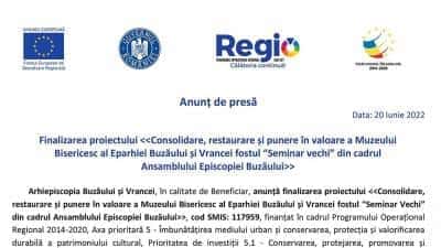 Finalizarea proiectului < Arhiepiscopia Buzăului și Vrancei, în calitate de Beneficiar, anunță finalizarea proiectului < Proiectul s-a implementat în municipiul Buzău, str. Aleea Episcopiei, nr. 3, județul Buzău și a avut o valoare totală de 21,080,439.33 lei, finanțarea nerambursabilă a fost de 20,225,352.82 lei, din care 17,191,549.89 lei din FEDR și 3,033,802.93 lei din bugetul național. Obiectivul general al proiectului a vizat impulsionarea dezvoltării locale prin conservarea, protejarea și valorificarea patrimoniului cultural - Muzeul Bisericesc al Eparhiei Buzăului și Vrancei - fostul „Seminarul Vechi” din cadrul Ansamblului Episcopiei Buzăului. Pentru atingerea obiectivului general au fost stabilite următoarele obiectivele specifice ale proiectului: restaurarea și consolidarea obiectivului de patrimoniu – „Seminarul Vechi” care adăpostește Muzeul Bisericesc Eparhial al Arhiepiscopiei Buzăului și Vrancei și punerea în valoare (valorificarea și promovarea durabilă) a acestuia. Rezultatele proiectului sunt: După ce a trecut printr-un amplu proces de consolidare, restaurare și amenajare, Muzeul Bisericesc Eparhial al Arhiepiscopiei Buzăului și Vrancei pune la dispoziția celor care îi trec pragul o colecție impresionantă de obiecte și bunuri de patrimoniu religios. Expoziția de bază și expozițiile anexe acoperă 13 săli și două holuri, fiecare sector expozițional având organizare proprie, respectând succesiunea cronologică și tipologică, pentru a cunoaște și înțelege evoluția artei religioase în Eparhia Buzăului și Vrancei. Proiectul implementat de Arhiepiscopia Buzăului și Vrancei are un impact pozitiv în dezvoltarea turismului local și regional. Conservarea moștenirii culturale este strâns legată și de dezvoltarea turismului: restaurarea și conservarea unui obiectiv de patrimoniu cultural, dacă este completată de o promovare continuă și eficientă, poate să contribuie la dezvoltarea sectorului turistic, sector care la rândul său poate genera puternice efecte economice, sociale și culturale la nivel local/ județean/ regional/ național. Prin proiectul <<Consolidare, restaurare și punere în valoare a Muzeului Bisericesc al Eparhiei Buzăului și Vrancei fostul “Seminar Vechi” din cadrul Ansamblului Episcopiei Buzăului>>, cod SMIS: 117959, a fost redat publicului larg un obiectiv de patrimoniu cultural restaurat, conservat și amenajat corespunzător în vederea desfășurării în bune condiţii a activităţii Muzeului Bisericesc Eparhial al Arhiepiscopiei Buzăului și Vrancei, și în același timp care să poată genera puternice efecte economice, sociale și culturale în municipiul Buzău, județul Buzău și regiunea Sud-Est. Informaţii suplimentare despre proiect se pot obţine la: Tel./Fax: 0238-413608; E-mail: arhiepiscopiabzvn@yahoo.com, contact@arhiepiscopiabzvn.ro; Website: www.arhiepiscopiabzvn.ro. Arhiepiscopia Buzăului și Vrancei - Aleea Episcopiei, nr. 3, Municipiul Buzău, Județul Buzău, cod 120024 Investim în viitorul tău! Proiect cofinanțat din Fondul European de Dezvoltare Regională prin Programul Operațional Regional 2014-2020 www.inforegio.ro | facebook.com/inforegio.ro Urmăreşte pagina de Facebook „Telegrama” pentru ştiri şi analize de ultimă oră!