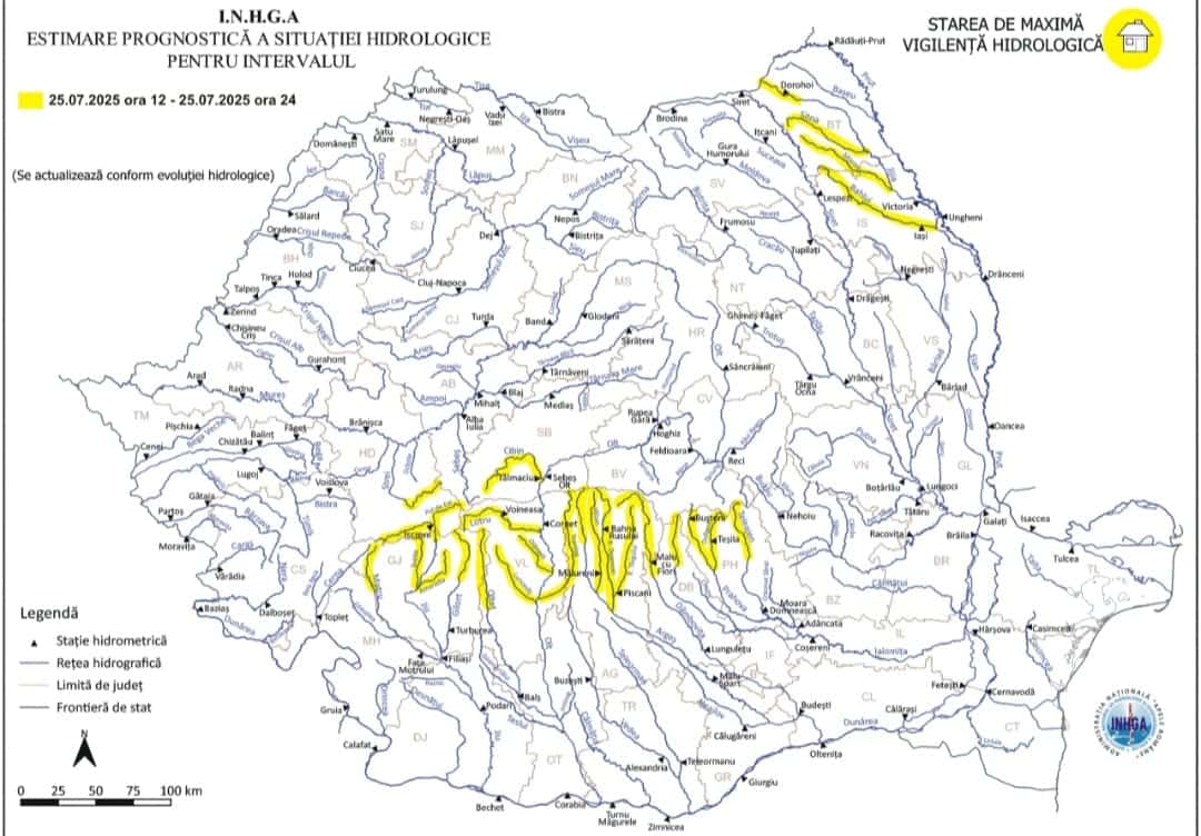 Alerta hidrologică este valabilă în data de 25 iulie 2025 în intervalul orar 12:00 - 24:00.