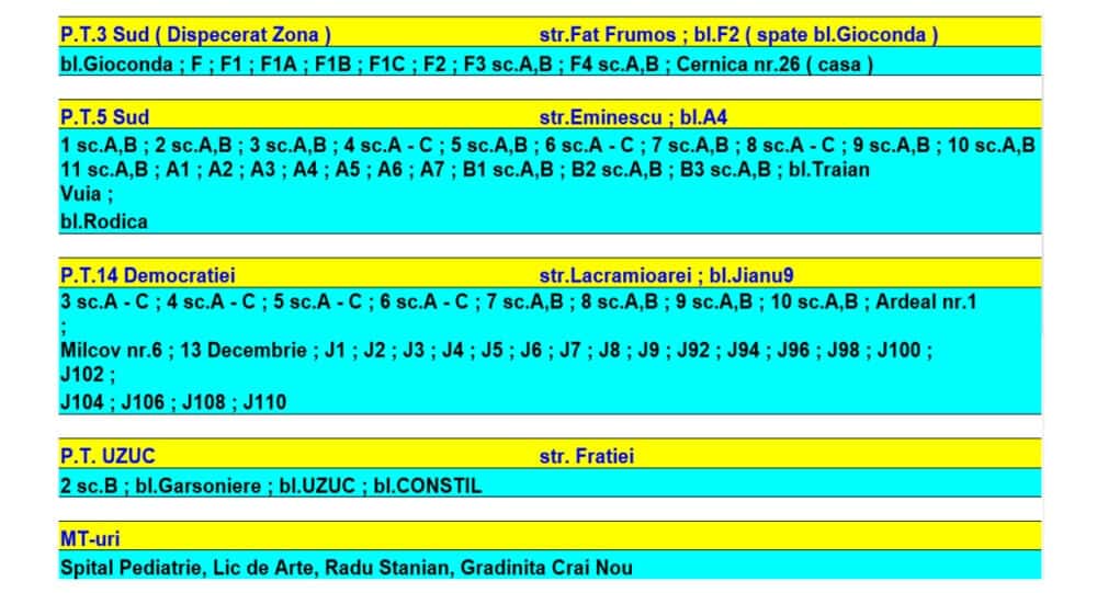 „Astăzi, 12.02.2026, în intervalul orar 08:00 – 22:00, se va întrerupe furnizarea agentului termic pe Magistrala Jianu, pentru remedierea unei avarii apărute pe strada Teleajen, în zona căminului de racord general, în spatele blocului 9C”, au anunțat reprezentanții Termo Ploiești.