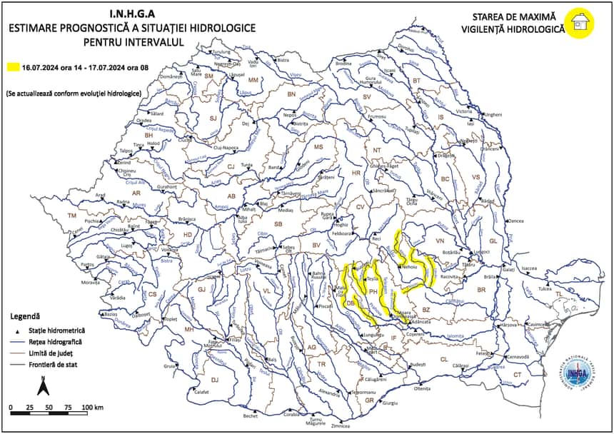 ”Având în vedere situaţia hidrometeorologică actuală şi prognoza meteorologică pentru următoarele 24 de ore, specialiştii I.N.H.G.A. au emis Codul galben, cu valabilitate începând de astăzi, de la ora 14:00, până miercuri, la ora 8:00”, a transmis, marţi, INGHA.