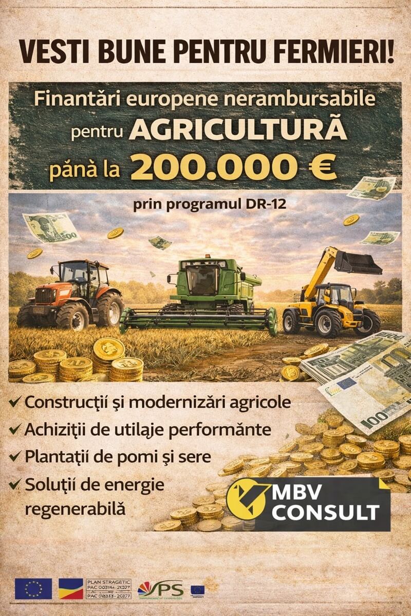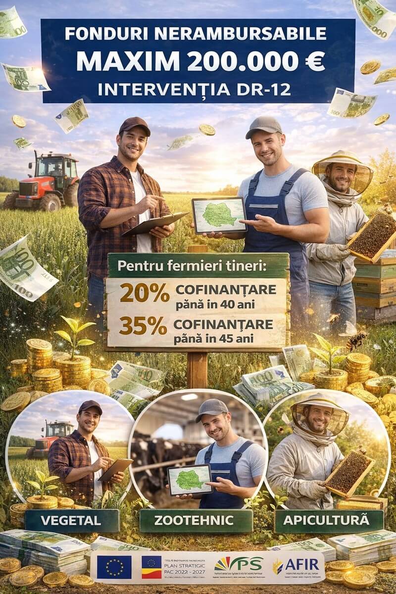 Intervenția DR-12 (Investiții în consolidarea exploatațiilor tinerilor fermieri instalați și a fermierilor cu vârsta de maximum 45 de ani) este disponibilă în cadrul Planului Strategic PAC 2023–2027. Potrivit experților din cadrul MBV EURO CONSULTING TEAM SRL este destinată susținerii investițiilor în agricultură.