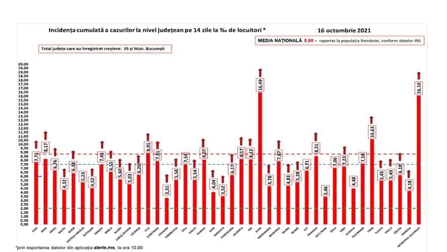 Rata infectărilor, în România, este de 8,8 la mie, iar toate județele sunt, de astăzi, în scenariul roșu, după ce și Covasna a trecut de 3 cazuri active/1.000 de locuitori, potrivit celui mai nou bilanț al pandemiei transmis de Grupul de Comunicare Strategică.