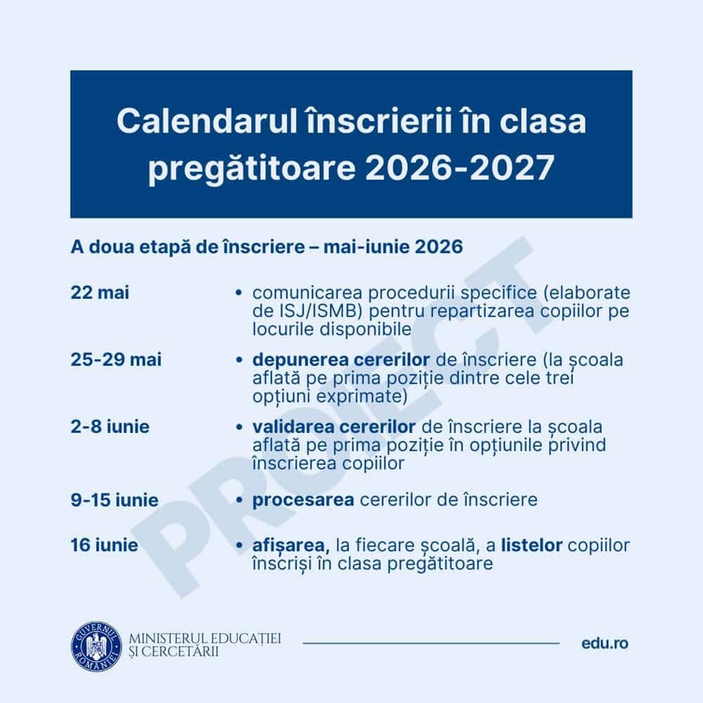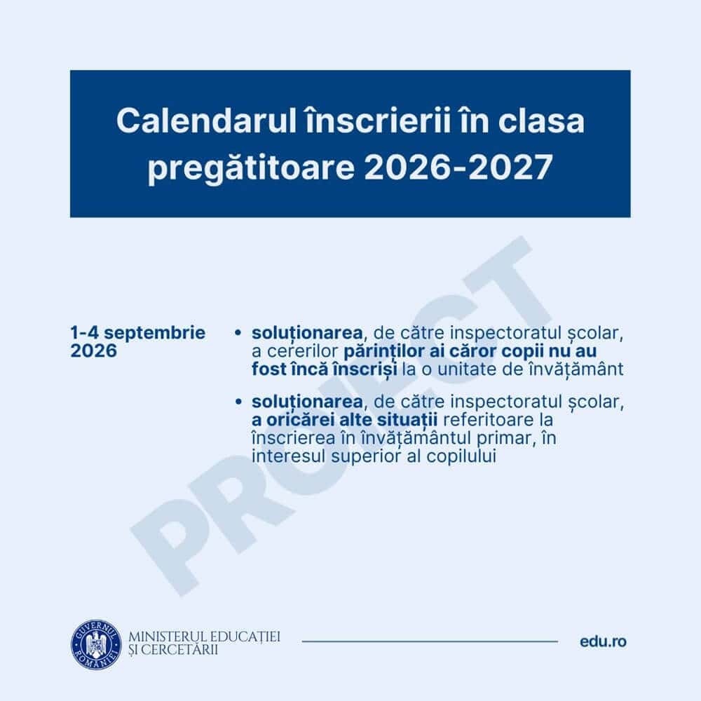 Ministerul Educației a publicat calendarul propus pentru înscrierea la clasa pregătitoare în anul școlar 2026 - 2027. Înscrierea este obligatorie în cazul copiilor care împlinesc 6 ani până cel târziu pe 31 august.