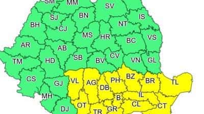 "În intervalul menţionat, în Muntenia, Dobrogea şi estul Olteniei, vor fi perioade cu instabilitate atmosferică accentuată, ce se va manifesta prin averse torenţiale, frecvente descărcări electrice, intensificări de scurtă durată ale vântului cu viteze de 55....65 km/h şi izolat de peste 70...80 km/h, pe alocuri vijelii şi grindină. Cantităţile de apă vor depăşi 25...35 l/mp", anunţă ANM.