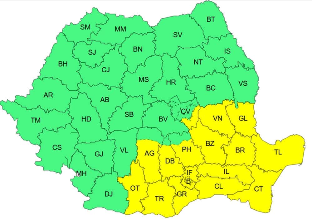 Codul galben este valabil în București, Ilfov, Olt, Teleorman, Giurgiu, Călărași, Ialomița, Brăila, Galați, Tulcea, Constanța, Vrancea, Buzău, Dâmbovița, Argeș, Prahova și Covasna.