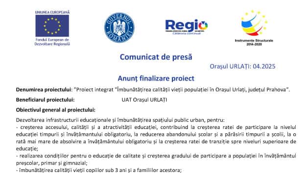 Comunicat de presă Orașul URLAȚI: 04.2025   Anunț finalizare proiect Denumirea proiectului: ”Proiect integrat "Îmbunătățirea calității vieții populației în Orașul Urlați, județul Prahova”.