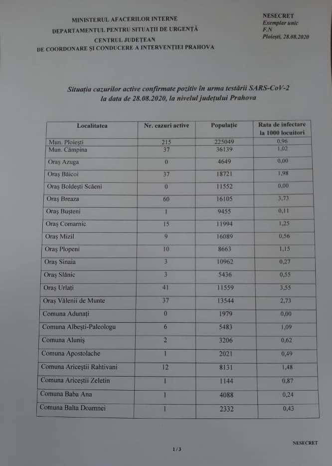 Situația detaliată întocmită, pentru ziua de vineri, de Centrul Județean de Coordonare și Conducere a Intervenției Prahova, pentru ziua de vineri, arată că județul avea 786 de cazuri active, la o populație de 787.529 de locuitori, deci o rată de infectare de 0,99 la mie. În mai multe localități, însă, media este de două, chiar de trei ori mai mare.