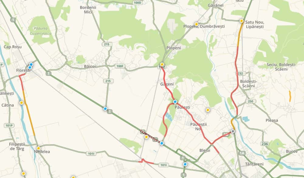 La ora 18.00, mai multe accidente ușoare erau raportate în zona sensului giratoriu suspendat de la Păulești și la cel de la Blejoi, iar ruta ocolitoarea prin Găgeni era complet blocată.