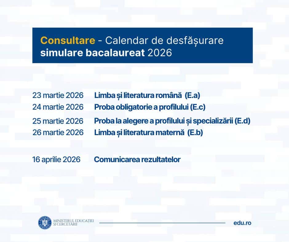 De asemenea, au fost publicate propunerile de calendar pentru simulările ce vor fi organizate în noul an școlar. Atât în cazul viitorilor absolvenți de gimnaziu, cât și pentru elevii de clasa a XII-a, testările vor avea loc în luna martie: