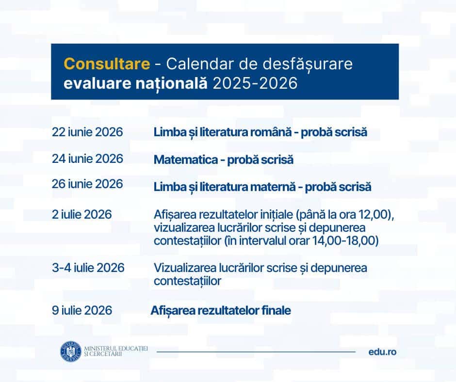 „Probele scrise ale evaluării naționale, respectiv ale examenului național de bacalaureat se vor desfășura după finalizarea cursurilor anului școlar 2025 - 2026. Probele de evaluare a competențelor se vor desfășura după încheierea cursurilor anului școlar 2025 - 2026 pentru clasa a XII-a. Pentru probele scrise se păstrează prevederea prin care este permisă vizualizarea lucrărilor după afișarea rezultatelor inițiale și înainte de contestații, atât la evaluarea națională, cât și la bacalaureat”, subliniază reprezentanții Ministerului Educației care subliniază că la acest moment este vorba despre niște propuneri, iar forma finală a documentelor va fi aprobată în urma analizei feedbackului primit și după ședința Comisiei de Dialog Social (CDS).