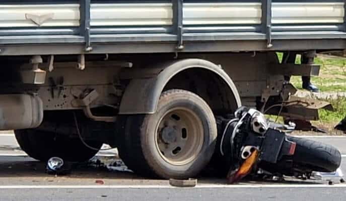 Imaginile publicate pe grupul INFO TRAFIC PRAHOVA arată că motocicleta a rămas blocată sub roțile din spate ale unei camionete cu număr de Ilfov.
