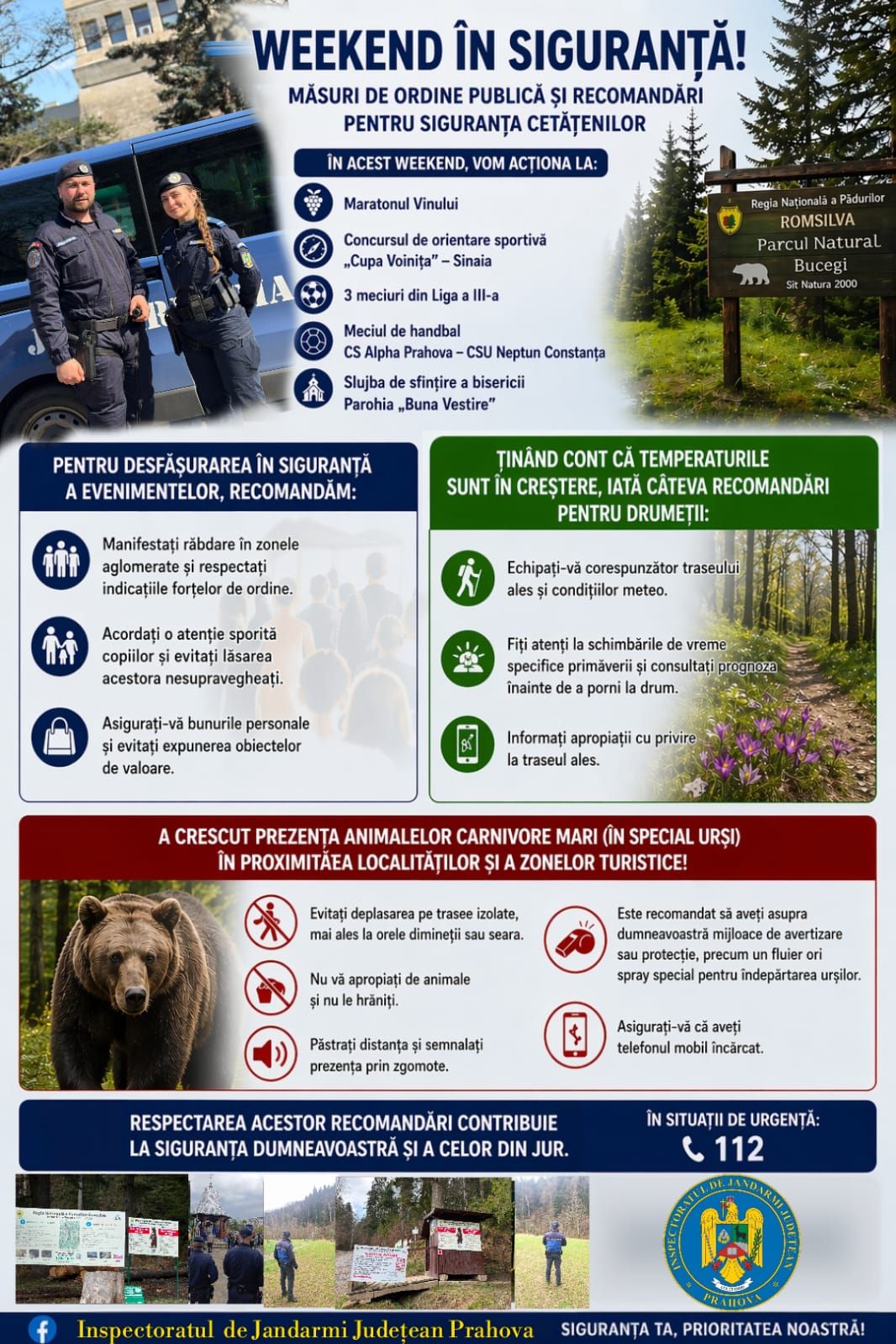 În acest sfârșit de săptămână jandarmii prahoveni vor acționa pentru asigurarea măsurilor de ordine și siguranță publică la mai multe evenimente organizate la nivelul județului: Maratonul Vinului de la Urlați, concursul de orientare sportivă „Cupa Voinița” din Sinaia, meciurile din Liga a III-a, partida de handbal dintre CS Alpha Prahova și CSU Neptun Constanța, precum și la slujba de sfințire a bisericii Parohia „Buna Vestire”.