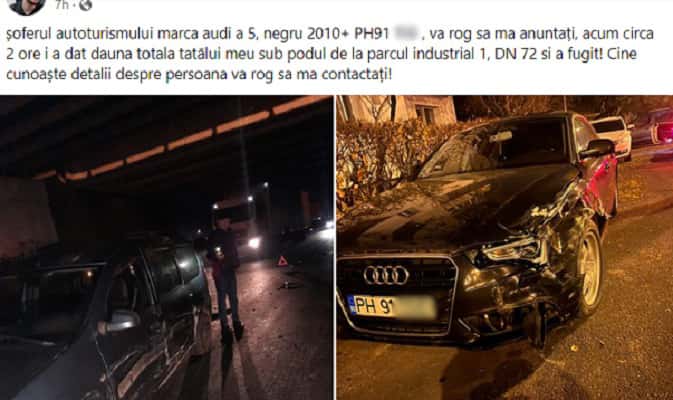 Un ploieștean reclamă, într-o postare publicată azi-noapte pe un grup de Facebook dedicat șoferilor, un accident petrecut în jurul orei 00.00, pe DN72, în care au fost implicați tatăl său și un alt conducător auto care a fugit de la locul evenimentului. Tânărul a povestit că a găsit mașina fugarului, la vreo două ore de la incident, parcată în fața unui bloc din Ploiești. Mulți dintre cei care au comentat la postarea sa au atras atenția asupra faptului că, în caz de tamponare, conducătorii auto au un răgaz de 24 de ore pentru a se prezenta la Poliție. În cazul celor care s-au urcat la volan beți sau drogați, acest interval poate fi folosit pentru a scăpa de dosar penal.