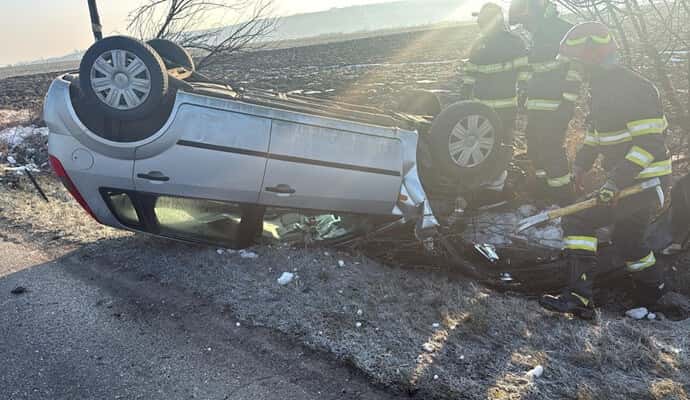 Un accident rutier soldat cu rănirea unei persoane a avut loc, vineri dimineață, în Prahova, pe DJ102E. În mașina care s-a răsturnat se afla doar conducătorul auto, o tânără de 25 de ani.