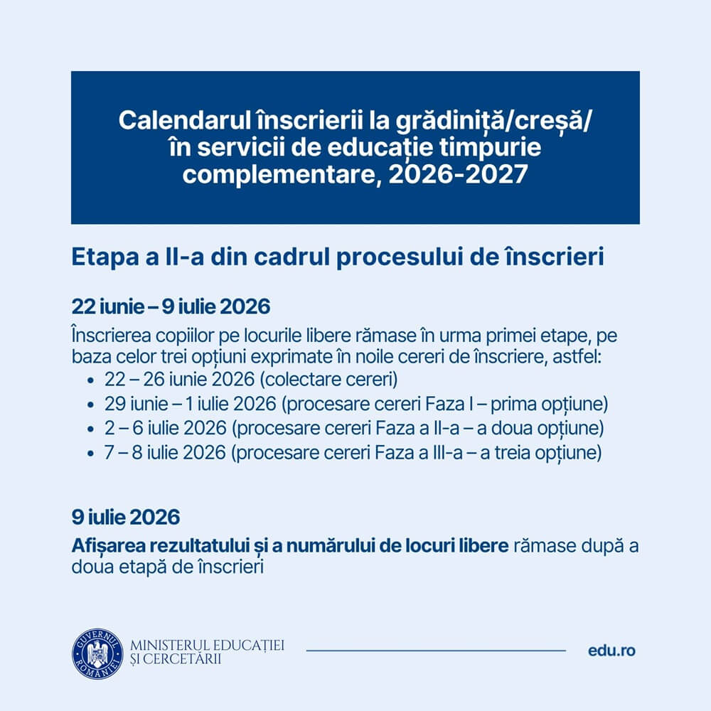 Ministerul Educației a stabilit și publicat calendarul valabil pentru înscrierile la creșă și grădiniță în anul școlar 2026 - 2027. Oficialii subliniază că solicitările nu vor fi aprobate în ordinea depunerii lor, ci pe baza criteriilor prevăzute de metodologie.