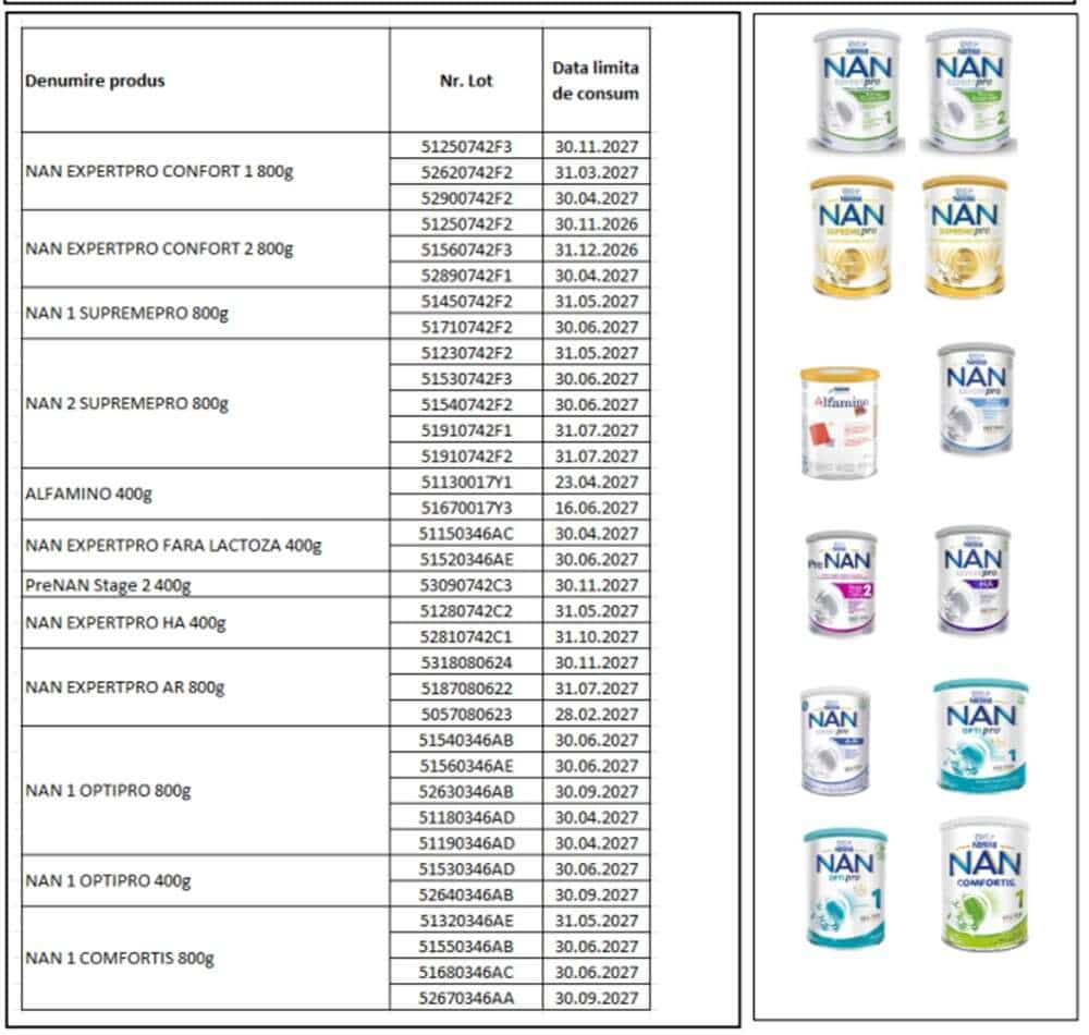 „Ca măsură de precauție, Nestlé România recheamă voluntar o cantitate limitată din formulele de lapte cu datele de identificare menționate în anexă. Siguranța și bunăstarea sugarilor